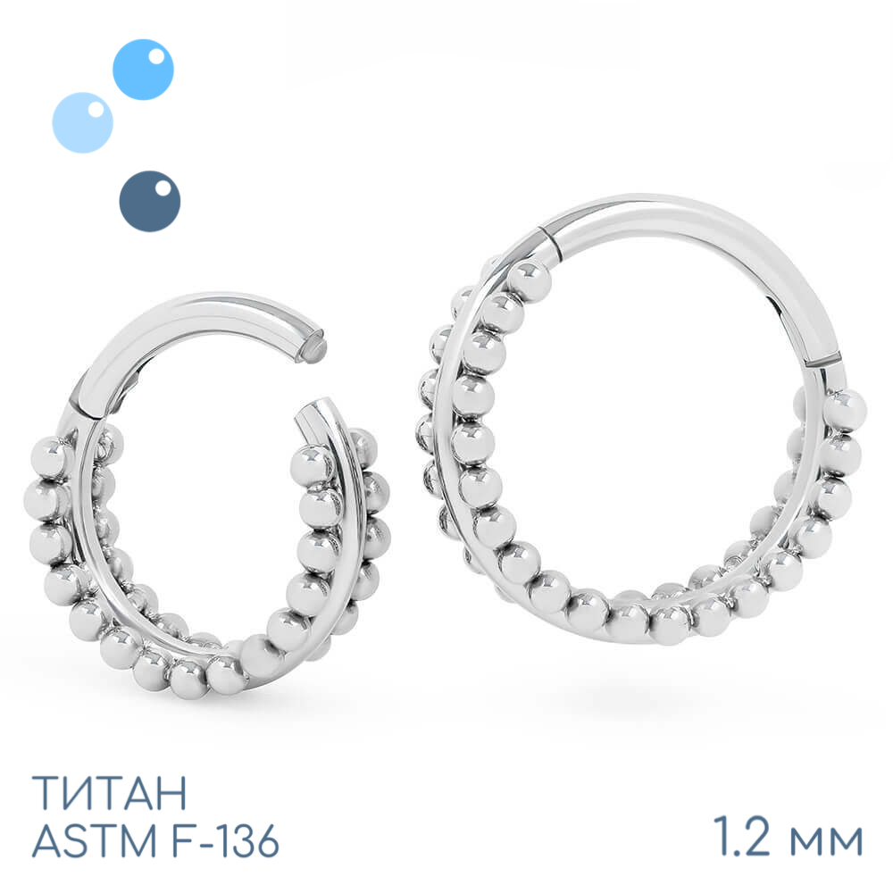 Кольцо-кликер для пирсинга Eliza изготовлено из титана марки ASTM F-136. Украшена с каждой из боковых стороны рядом титановых шариков.